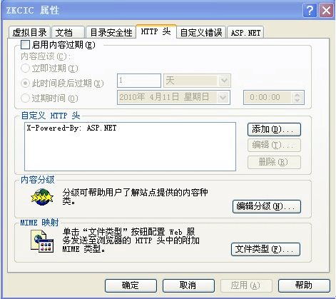展开网站找到ZKCIC虚拟目录,点右键选择属性,再选择“HTTP头”选项卡。